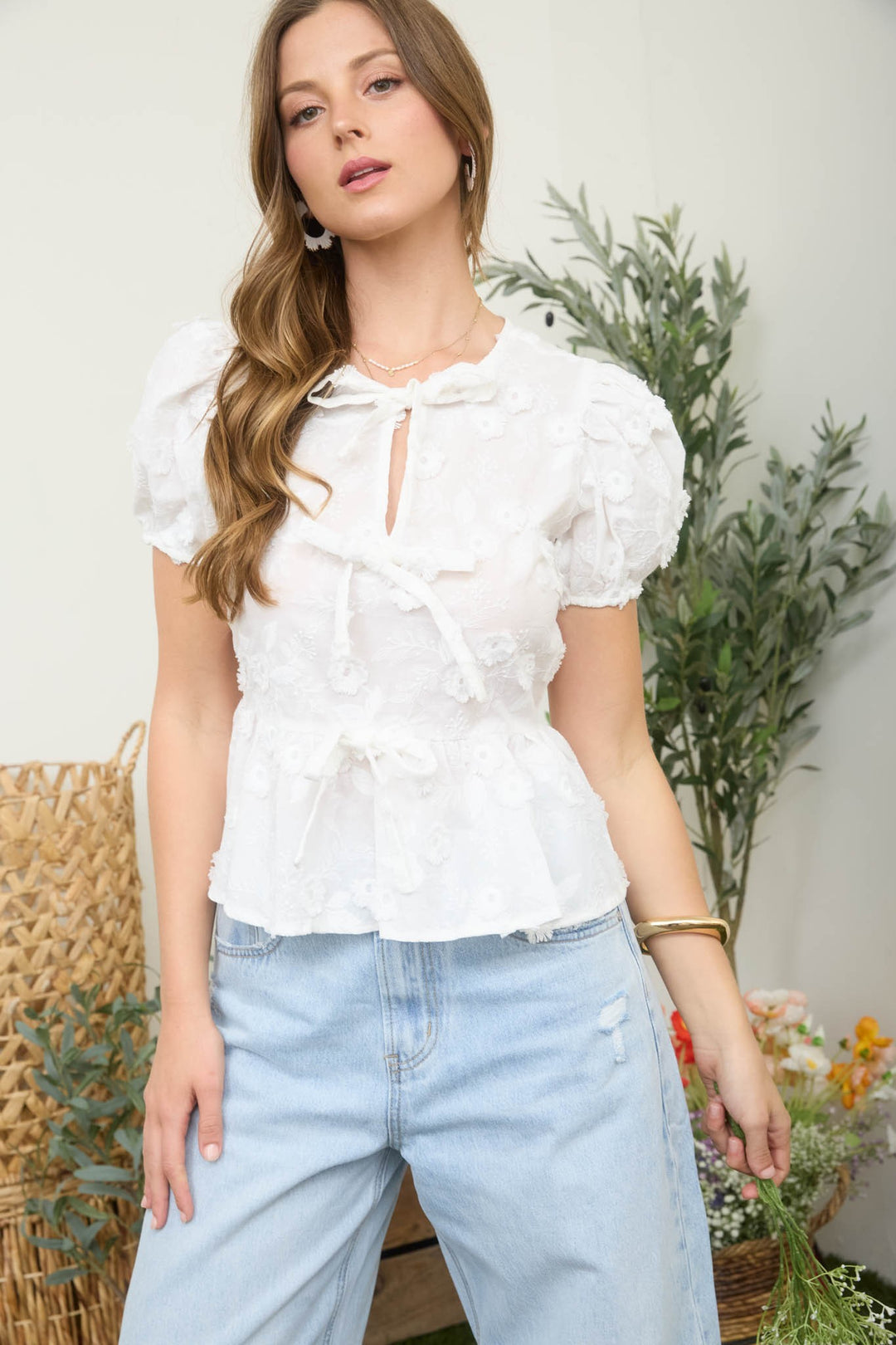 3d Embroidered Flower Front Tie Puff Sleeve Top