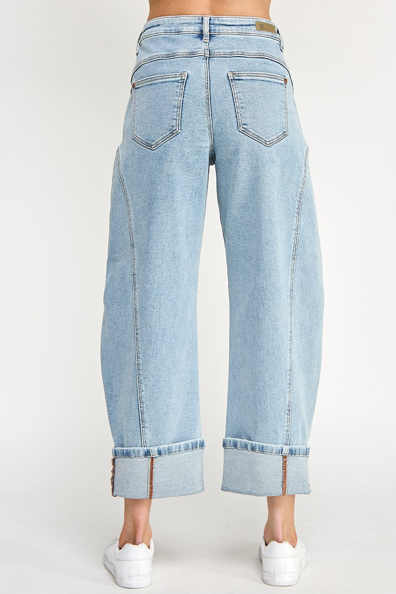 These high-rise barrel wide cuffs bring a fun twist to your denim collection. With a comfy stretch, they hug your curves while giving you room to move. The 10 ½” front rise and 26 ½” inseam hit just right for a flattering fit, and the 18” leg opening adds a breezy, wide-leg vibe. Perfect for dancing through your day with style and comfort!